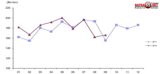 Tavuk eti üretimi Eylül ayında bir önceki aya göre %2,4, bir önceki yılın aynı ayına göre %7,1 arttı. Eylül ayında hindi eti üretimi ise bir önceki aya göre %8,2, bir önceki yılın aynı ayına göre %30,5 arttı.