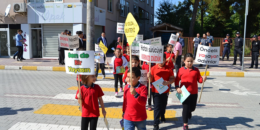 Alaçam Cumhuriyet İlkokulu öğrencileri Ellerinde "Yaya geçidi kullan, yaya öncelikli trafik, dikkatli geç, yaşamı seç, dur yolda bende varım, hatalı sürücüye kırmızı düdük, sen de bir yayasın, öncelik yayanın, hayata yol ver" yazılı pankartlar taşıyan öğrencilere, yaya geçidi kuralları uygulamalı gösterildi.