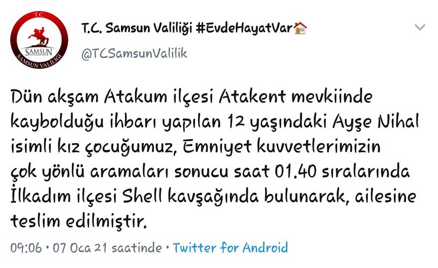 Samsun Valiliği’nden konuyla ilgili yapılan acıkmada, “Dün akşam Atakum ilçesi Atakent mevkisinde kaybolduğu ihbarı yapılan 12 yaşındaki Ayşe Nihal isimli kız çocuğumuz, emniyet kuvvetlerimizin çok yönlü aramaları sonucu saat 01.40 sıralarında İlkadım ilçesi Gar Kavşağı’nda bulunarak, ailesine teslim edilmiştir” denildi.