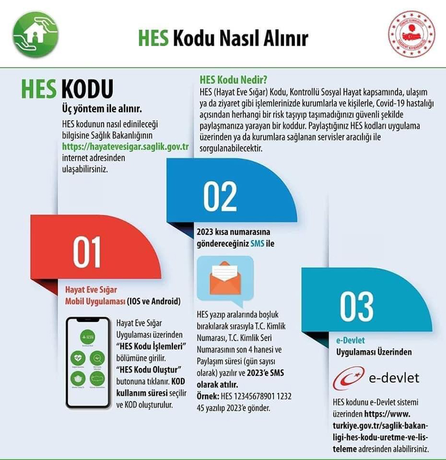 “Hayat Eve Sığar” (HES) uygulamasından, e-Devlet’ten ve kısa mesaj servisinden (SMS) alınan HES koduyla;