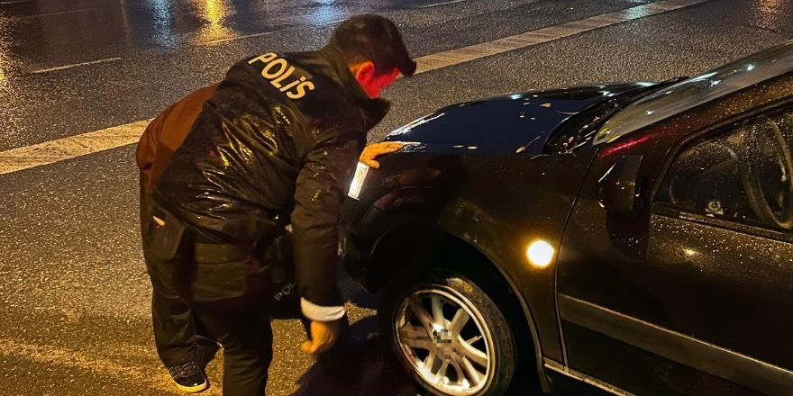 Sağanak yağışa rağmen aracın lastiğini değiştiren polis ekipleri, sürücünün güvenli şekilde yoluna devam etmesini sağladı.