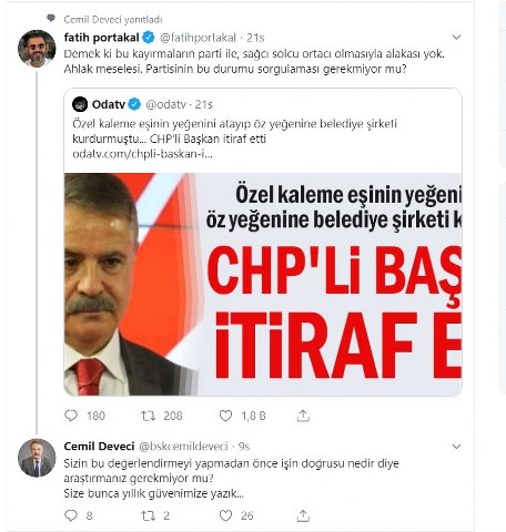 Atakum Belediye Başkanı Cemil Deveci, sosyal medya üzerinden söz konusu haberler ilgili kendisini eleştiren FOX TV Ana Haber sunucusu, gazeteci Fatih Portakal'a sosyal medya üzerinden yanıt verdi.