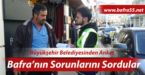 Samsun Büyükşehir Belediyesi Ulaştırma Daire Başkanlığı ekipleri tarafından sabah saatlerinde Bafra'ya gelen 15 kişilik ekip Bafra'nın çeşitli sokak ve Caddelerine dağılarak vatandaşa Bafra'nın en büyük sorunları haline gelen yaya kaldırımı işgali ve otopark sorunu konularında sorular sorarak anket yapıyorlar.