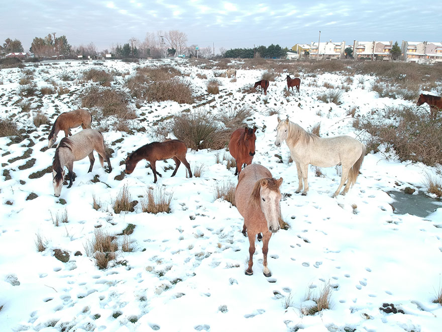 Sinop’ta yılkı atlarının kar altında yiyecek bulmak için verdikleri zorlu mücadele havadan görüntülendi. Drone gören yılkı atları önce şaşırdı, sonra kameralara adeta poz verdi.