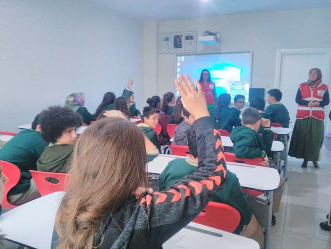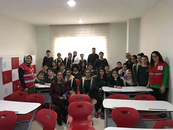 Türk Kızılay’ı Bafra şubesi adına okulda bilgileri aktaran İncilay Toker,” Türk Kızılay’ı, kuruluşundan itibaren gerçek gücünü, yüce insani değerler doğrultusunda yardım ellerini ihtiyaç sahiplerine uzatan bağışçılarından almıştır. Hiçbir karşılık beklemeksizin bizlere emanet edilen en kutsal bağış, kuşkusuz bir hastanın ya da bir yaralının hayata tutunmasını sağlayan “Kan” dır. “29 Ekim – 4 Kasım” tarihleri arasında Kızılay haftası etkinlikleri çerçevesinde Türk Kızılay’ı genel merkezi ve Türkiye genelinde tüm şubeleri tarafından çeşitli etkinliklerle kutlanan bu haftada Türk Kızılay’ının kuruluş amacı ve yürüttüğü insani yardım faaliyetleri özellikle öğrencilere, gençlere ve kamuoyuna anlatılarak, Türk Kızılay’ına ve faaliyetlerine yönelik farkındalık yaratılmaktadır. Bu vesile ile yardımsever halkımızı, insani değerler adına bir kez daha gönüllü kan bağışçısı olmaya davet ediyorum.”