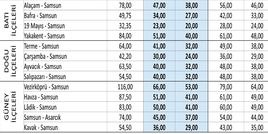 Alınan kararın ardından Samsun’da şehir içi servis ücreti 735 TL’den 882 TL’ye, Atakum-şehir merkezi 835 TL’den 1002 TL’ye, Atakum içi 700 TL’den 840 TL’ye, Tekkeköy-şehir içi 835 TL’den 1002 TL’ye, Samsun-Çarşamba 1250 TL’den 1500 TL’ye, Samsun-Bafra 1345 TL’den 1614 TL’ye, Samsun-Kavak 1345 TL’den 1614 TL’ye, Samsun-Terme 1370 TL’den 1644 TL’ye, Samsun-Havza 1700 TL’den 2040 TL’ye, Samsun-Asarcık 1655 TL’den 1986 TL’ye ve Samsun-Ladik 1700 TL’den 2040 TL’ye yükseltildi.