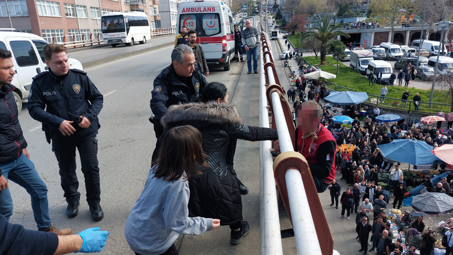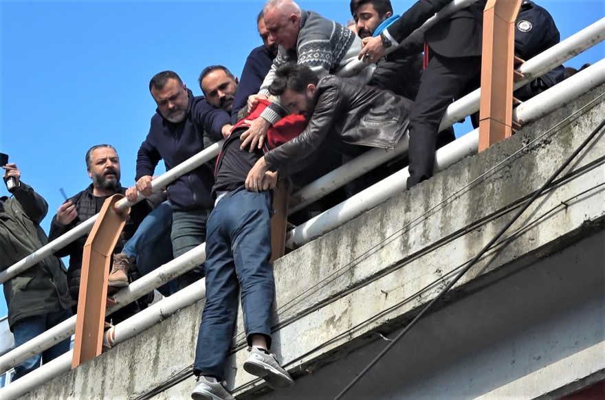 Samsun'da eşinden boşanan ve üst geçitte boynuna halat geçirip korkuluklarda intihara kalkışan 3 çocuk babası şahıs, kendilerini riske atan polis ve vatandaşlar tarafından güçlükle kurtarıldı.
