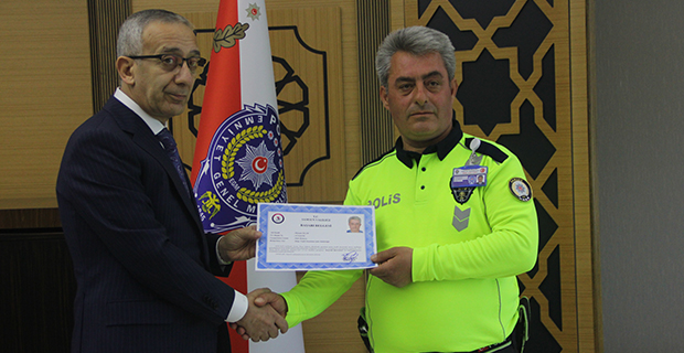 Denizde boğulma tehlikesi geçiren kadını kurtaran polis memuru Ersin Özbek ile çocuğunu göz ameliyatına götürürken kaza yapan babaya özel aracını veren trafik polisi Mustafa İslam'a başarı belgesi verilmesi dolayısıyla İl Emniyet Müdürü Yavuz'un makamında tören düzenlendi.