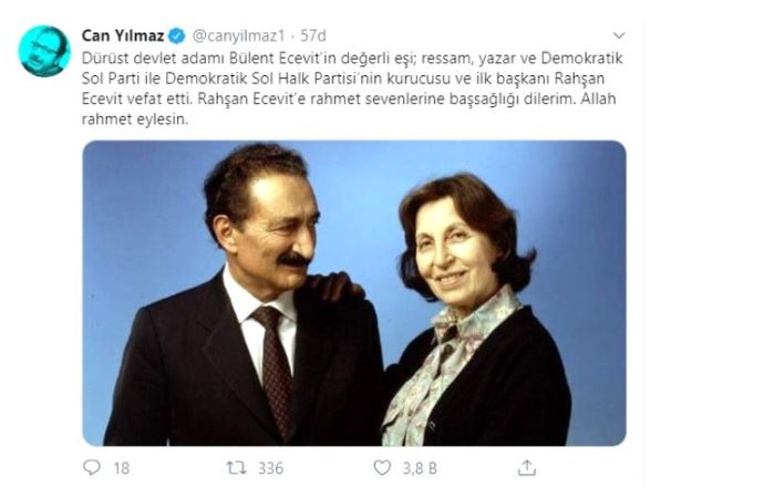 CAN YILMAZ: Dürüst devlet adamı Bülent Ecevit'in değerli eşi; ressam, yazar ve Demokratik Sol Parti ile Demokratik Sol Halk Partisi'nin kurucusu ve ilk başkanı Rahşan Ecevit vefat etti. Rahşan Ecevit'e rahmet sevenlerine başsağlığı dilerim. Allah rahmet eylesin.