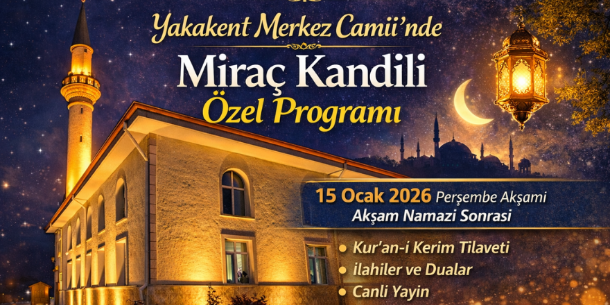 Yakakent ilçesinde Miraç Kandili dolayısıyla Merkez Camii’nde özel bir program düzenlenecek. Program, 15 Ocak 2026 Perşembe günü akşam namazının ardından gerçekleştirilecek.